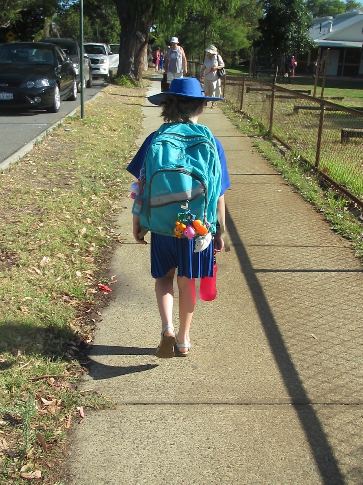 Walking along the sidewalk to school (on the right)